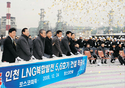 포스코(회장 이구택)는 24일 포스코파워 인천발전소에서 LNG복합발전소 착공식을 갖고 600MW급 발전소 2기(5·6호기) 건설을 시작했다. 이번에 착공하는 발전설비가 가동되면 포스코파워는 기존에 운영하던 1800MW를 포함해 모두 3000MW의 발전용량을 확보, 민간 최대 발전사업자로 확고하게 발돋움하게 된다.