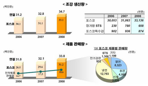 포스코의 2008년 조강 생산량은 3,310만톤으로 전년대비 6.4%, 제품 판매량은 3,120만톤으로 5.4%의 비교적 높은 증가율을 기록했다. 전 세계적인 4분기 시황악화에도 불구하고 설비 신증설 및 합리화 완료 및 생산성 향상에 따른 조강 및 제품 생산능력 확충에 따른 결과로 보인다.