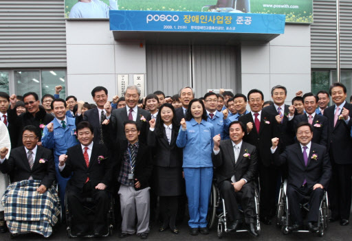 <사진설명2>포스코는 21일 포스코 본사에서 포스코 이구택 회장, 이영희 노동부장관, 김관용 경북도지사, 박승호 포항시장, 장애인협회 관계자 등 200여 명이 참석한 가운데 국내 대기업 최초로 설립한 장애인 자회사 포스위드 사업장 준공식을 가졌다.