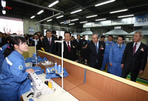 <사진설명1> 포스코는 21일 포스코 본사에서 국내 대기업 최초로 설립한 장애인 자회사 포스위드 사업장 준공식을 가졌다. 준공식 후 이영희 노동부장관(오른쪽부터), 포스코 이구택 회장, 김관용 경북도지사, 박승호 포항시장 등이 클리닝센터를 돌아보며 직원들을 격려하고 있다.