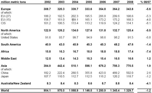 대륙별로 보면 아시아 지역만 2002년 이후 6년 연속 증가세를 보였고, 세계 조강 생산 중 58%를 차지한 것으로 나타났다. 반면, 유럽 및 북미 지역 조강 생산 하락기에 접어든 것으로 파악됐다.