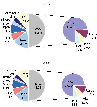 또 브라질, 인도, 러시아, 중국이 포함된 BRIC 생산 비중이 세계 조강생산의 48.2%를 차지하며 성장세를 이어갔고, EU27개국 점유율은 15.6%에서 14.9%로 낮아졌다.