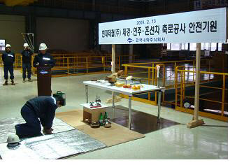 축로공사는 고로에서 만들어진 쇳물 ‘용선’을 운반하는 철도차량인 토페도카 내 내화물을 쌓아 용선의 열이 전달되지 않도록 한다. 오는 12월말까지 토페도카 22대에 내화물 2854톤을 쌓을 계획이다. 공급사인 한국내화 김영곤 기사는 “건설현장 직원이 모두 일치단결해 내화물 축로공사 준공 때까지 무재해를 달성할 수 있도록 해 달라”고 안전기원문을 낭독했다.