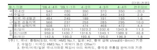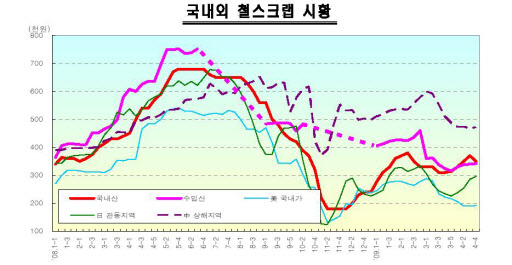 국낸 철스크랩은 4월들어 가격상승 기대감으로 철스크랩 가격이 강세를 유지했으나, 제강사의 수입 철스크랩 구매확대 및 국내 구입가격 인하를 실시해 4월말부터 상승추세가 꺽이면서 가격상승이 제한적일 것으로 예상되고 있다.