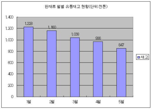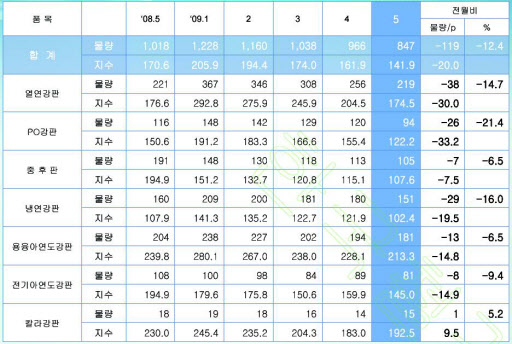 5월말 현재 국내 판재류 유통재고는 84만7,000톤으로 2007년 1월(88만3,000톤) 이후 가장 낮은 수준을 기록한 것으로 나타났다. 재고감소는 포스코 설비수리에 따른 열연강판, PO강판 유통向 출하 감소와 수입 감소 등에 따른 것으로 분석된다. 자동차, 가전산업의 수요 회복세도 유통재고 감소에 영향을 미쳤다.