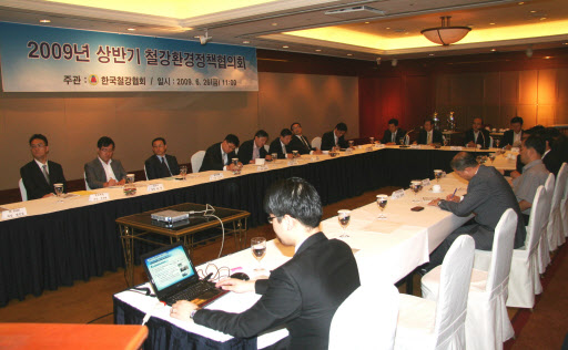 한국철강협회(회장 정준양)는 26일 오전 11시 서울 그랜드인터컨티넨탈 호텔에서 포스코, 현대제철, 동국제강 등 국내 주요 철강업계 환경담당 임원, 환경부 정영만 자원순환국장 등 20여 명이 참석한 가운데 “2009년도 상반기 철강환경정책협의회”를 개최했다.(사진 참조)