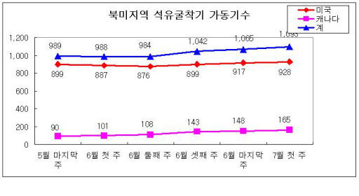 7월 첫 주 북미지역 석유굴삭기 가동기수(Drill Rigs)는 미국은 3주 연속 증가한 모습을 보였고, 캐나다는 증가세를 이어갔다.