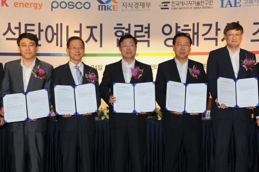 사진 왼쪽부터 김진균 고등기술연구원 부원장, 구자영 SK 에너지 사장, 이윤호 지식경제부 장관, 정준양 포스코 회장, 한문희 에너지기술연구원장