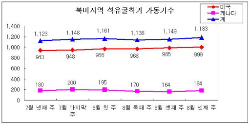 8월 넷째 주 북미지역 석유굴삭기 가동기수(Drill Rigs)는 미국은 증가세를 이어가면서 7주 연속 증가했고, 캐나다도 반등하면서 증가했다.