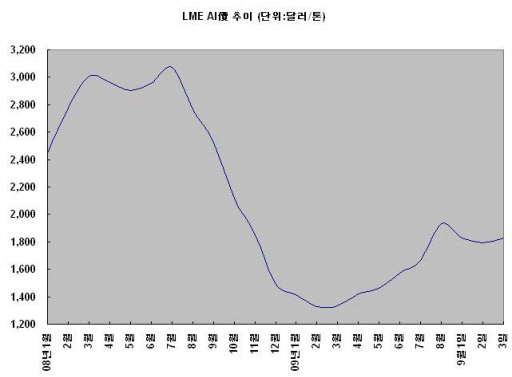 지난달 중순 이후 하향조정세에도 불구하고 8월 평균 런던금속거래소(LME) 알루미늄 가격은 10개월만에 최고치인 톤당 1,933.75달러를 기록했다. 9월 LME 알루미늄 가격은 단기반등에 이은 조정분위기 속에 톤당 1,800달러선을 중심으로 등락을 반복하며 저항하고 있다.