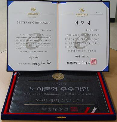 YK스틸(대표 최창대)이 9월 1일 노동부가 주최하고 노사발전재단이 주관한 '2009년도 노사문화 우수기업'에 선정돼노동부 장관으로 부터 인증서와 인증패를 받았다고 최근 밝혔다.