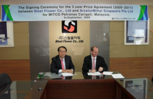 스틸플라워는 지난 9일 일본 및 유럽 등의 기업간의 경쟁속에서 아셀로미탈 프로젝트팀과의 협조를 통해 Petroas Calical와 향후 3년간 1억달러 규모의 후육관 5만톤을 공급하는 계약을 체결했다.
