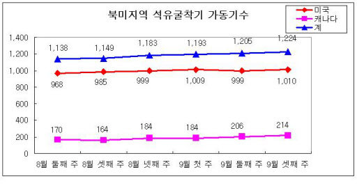 9월 셋째 주 북미지역 석유굴삭기 가동기수(Drill Rigs)는 미국과 캐나다 모두 증가한 모습을 보였다.