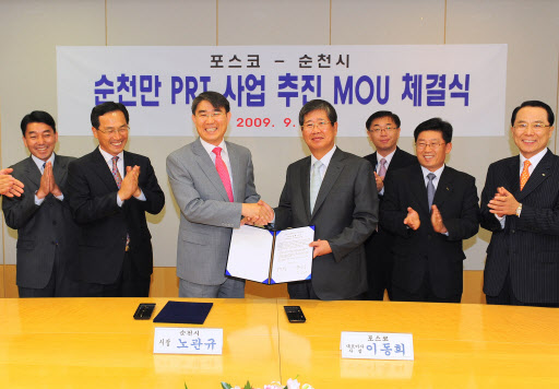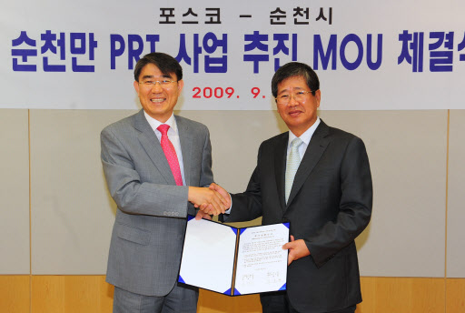 포스코 이동희 사장은 25일 오전 포스코센터에서 노관규 순천시장과 순천만 일대에 소형경전철 건설을 위한 양해각서(MOU)를 체결했다.