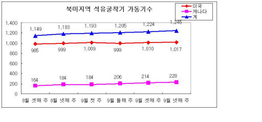 9월 넷째 주 북미지역 석유굴삭기 가동기수(Drill Rigs)는 미국과 캐나다 모두 증가한 모습을 보였다.