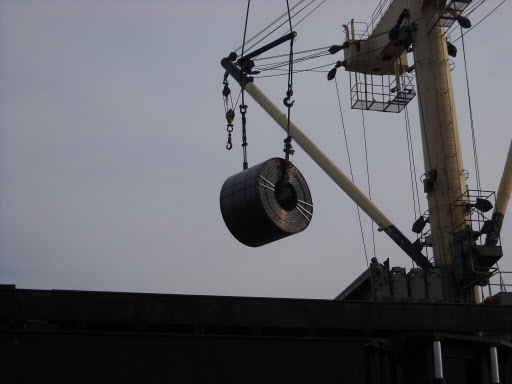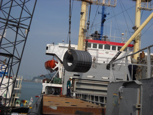 *사진설명 : 동부제철의 열연강판이 첫 해외수출에 성공, 지난 9월 28일 당진부두에서 선적되고 있다.