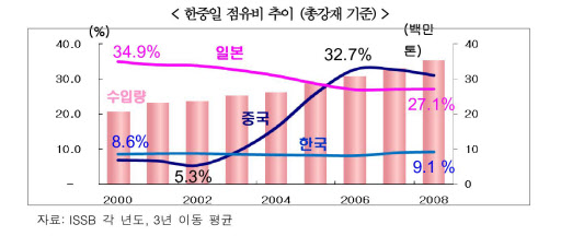 총 강재 점유율은 중국·일본 제품이 각각 30% 내외를 유지하고 있으나 한국 제품은 10% 이하에서 정체하고 있다. 중국 제품의 시장점유율은 2003년부터 급속히 증가하고 있는데 과거 봉형강류 중심에서 최근에는 일부 판재류 품목이 빠르게 증가하고 있다. 그러나 판재류 점유율은 일본이 41%로 최고 우위를 점하고 있는 가운데 중국 21%, 한국 14%로 한국은 판재류부문에서도 이미 중국에 뒤져 있다.