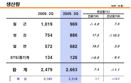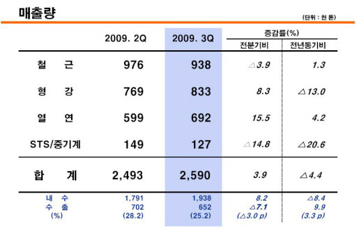 매출액별로 봐도 형강은 6,806억원으로 2분기 대비 8.7%, 열연은 4943억원으로 22%가 각각 증가한 반면 철근과 스테인리스는 각각 5.1%와 2.6% 줄었다. 전체 매출액은 2조 498억원으로 전분기대비 5.3% 증가했고, 전년 동기 대비 37.3% 감소했다.