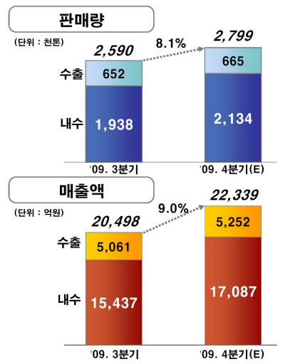 지난 3분기 총 259만톤(내수 193만8천톤, 수출 65만2천톤)의 제품을 판매했던 현대제철은 건설경기가 다소 회복세를 보이면서 철근과 H형강 등 봉형강류의 판매 개선과 자동차 시장 호황에 따른 열연강판 수요의 견조세에 힘입어 4분기 판매 증가가 예상된다고 성명했다.