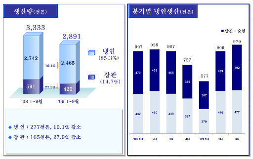 올해 현대하이스코의 냉연 생산량은 246만5,000톤으로 지난해 동기에 비해 10.1%가 급감한 것으로 조사됐다.