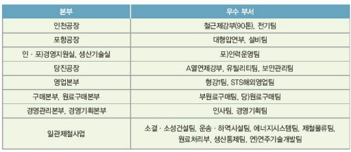 그 외 부서는 공장별 본부별 일정에 따라 시상 된다. 선정된 우수부서 명단은 다음과 같다.