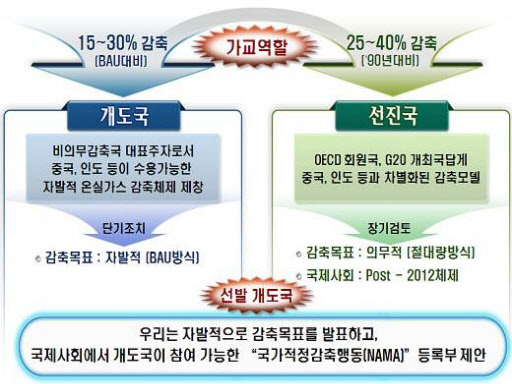 정부가 이번에 최종확정한 배출전망대비 30% 감축안은 IPCC(기후변화에 대한 정부간 패널, Intergovernmental panel on climate change)가 개발도상국에 권고한 감축범위(BAU 대비 15~30% 감축)의 최고수준으로 국내적으로 녹색성장 정책을 강력하게 추진하고 범지구적인 기후변화 대응노력에 적극 동참하는 분위기를 조성하는데 기여하려는 우리 정부의 의지를 반영한 것이다.