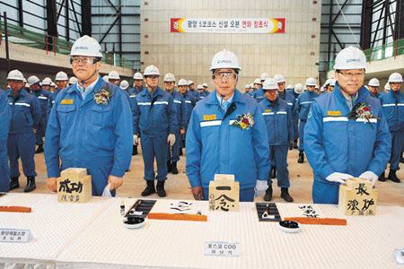 정준양 회장은 ‘우일신(又日新)’이라는 휘호가 적힌 연와(내화벽돌)를 보내왔다. 허남석 부사장은 연와에 ‘일념(一念)’이라는 휘호를 쓰고 코크스 오븐 안에 연와가 잘 자리 잡도록 망치로 두드렸다.