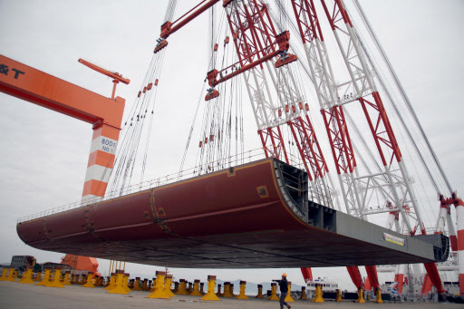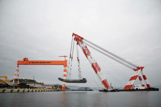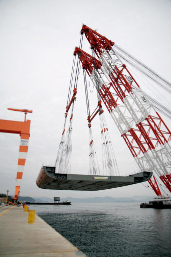 * 3,600톤 해상크레인으로 메가블록을 이동하는 모습