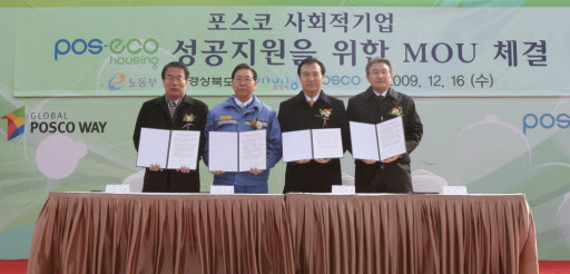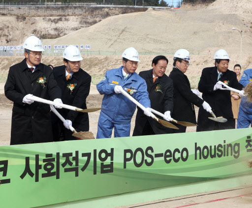 포스코는 16일 포항시 흥해읍 죽천리 연료전지공장 부지에서 정준양 회장, 임태희 노동부장관, 박승호 포항시장(오른쪽 네번째부터 왼쪽으로)등 관계자 150여명이 참석한 가운데 자립형 사회적기업‘POS Eco Housing’착공식을 가졌다.