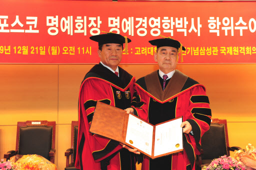 ▲ 박태준 포스코 명예회장(사진 우측)이 21일 고려대에서 명예경영학박사 학위를 수여받았다. 고려대는 박 명예회장이 포스코를 세계 최고의 철강기업으로 키워내고 다양한 장학사업으로 인재육성에 앞장 선 공로가 크다며 이날 학위를 수여했다. 이날 명예학위 수여식에는 포스코 정준양 회장 등 200여명이 참석해 박 명예회장의 학위 수여를 축하했다. 사진은 이기수 고려대 총장과 기념 포즈를 취하고 있는 박 명예회장의 모습.
