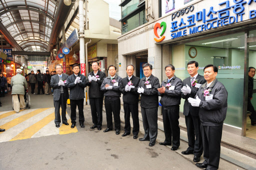 ▲ 포스코가 24일 강서구 화곡동에 미소금융 1호점을 열고 소득이나 신용등급이 낮아 금융권 대출을 받기 어려운 서민들 지원에 나섰다. 사진왼쪽 부터 김상영 포스코 전무, 문홍선 서울시 금융정책기획관, 홍성표 신용회복위원장, 정준양 포스코 회장, 김승유 중앙재단이사장, 진동수 금융위원장, 이동희 포스코 사장, 이용주 까치산시장 조합대표, 박귀찬 포스코 상무 방정환기자/bjh@snmnews.com 방정환 다른 기사 보기 저작권자 © 철강금속신문 무단전재 및 재배포 금지
