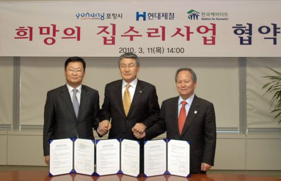 현대제철은 11일 포항시청에서 박승호 포항시장, 현대제철 김윤기 부사장, 한국해비타트 이창식 회장이 참석한 가운데 포항시 및 한국해비타트와 ‘희망의 집수리 사업’ 협약식을 체결했다고 밝혔다.