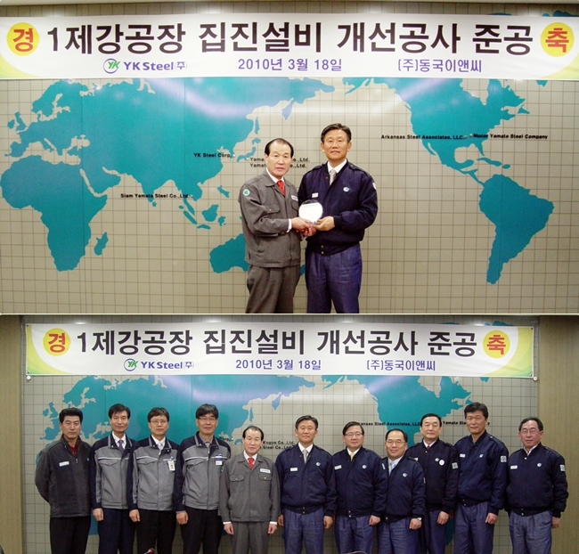 YK스틸(대표이사 최창대)은 1제강공장 집진설비 개선공사를 완료해, 3월 18일 YK Steel 최창대 사장과 관련 임원, 동국ENC 강원석 사장과 공사 관련 임원 등이 참석한 가운데 '완료보고회'를 가졌다고 밝혔다.