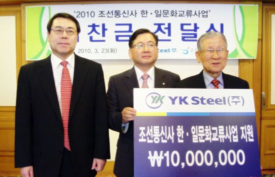 3월 23일 부산 코모도호텔에서 개최된 2010 조선통신사부산축제 지원금 전달식에서 YK 스틸 오오미치 히데타카 부사장(부산일본인회 회장)은 조선통신사 문화사업회 강남주 집행위원장에게 지원금 천만원을 전달했다.