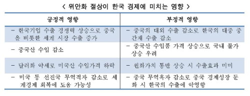 위안화 절상에 따라 우리 기업들에게는 긍정적 영향과 부정적 영향이 병존할 것으로 예상된다. 긍정적 요인으로는 수출가격 경쟁력 제고, 원료 수입가격 하락, 위안화 자산 가치 상승 등 기회요인 발생이 있다.