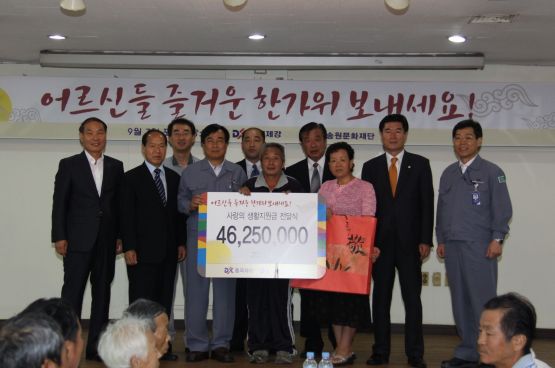 동국제강과 송원문화재단은 9월 7일 동국제강 포항제강소 인근 대송면 지역 독거노인 등 50명을 초청해 선물과 생활지원금 일인당 25만원씩을 전달했다.