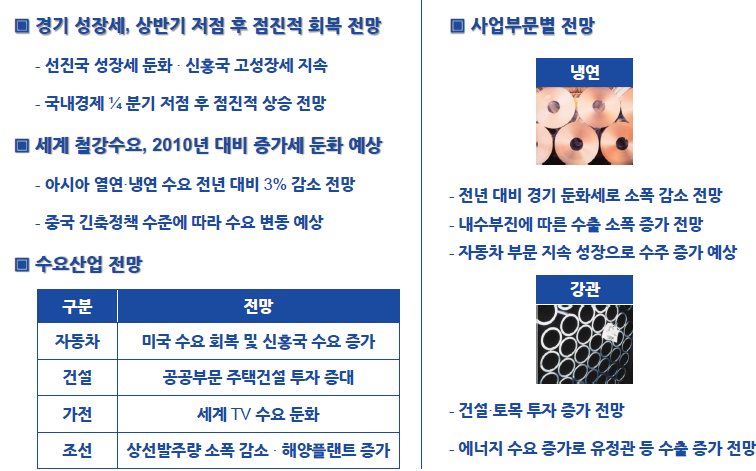 사업부문별로 냉연은 전년 대비 수요 증가세로 소폭 감소할 것이며 내수 부진에 따라 수출은 지난해 보다 증가, 자동차 부문 지속적인 성장으로 관련 수주는 오를 것으로 보인다고 밝혔다.