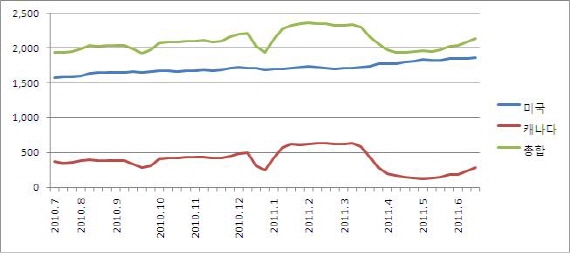 캐나다 동토지역의 해빙기가 마무리 되면서 북미지역의 리그(석유굴착장비) 가동 수가 급격히 증가했다.