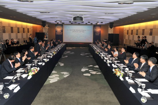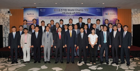 중소·중견기업 30개사가 참가한 ‘월드 챔프(World Champ)’ 발대식이 홍석우 코트라 사장, 김준동 지경부 산업경제정책관을 비롯해 DSR제강 홍하종 사장 등 참여업체 30개사 대표가 참석한 가운데 지난 12일 서울 코엑스 인터컨티넨탈호텔에서 개최됐다.