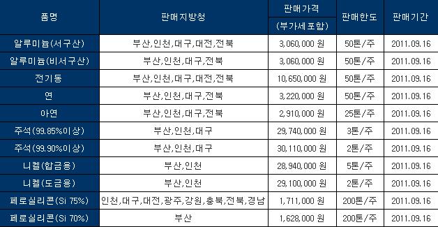 9월 16일 조달청 비철금속 비축물자 방출가격
