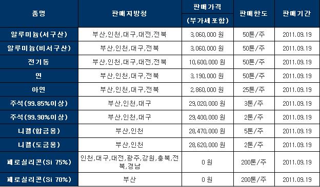 9월 19일 조달청 비철금속 비축물자 방출가격