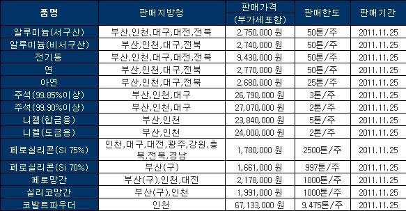 11월 24일 조달청 비철금속 비축물자 방출가격