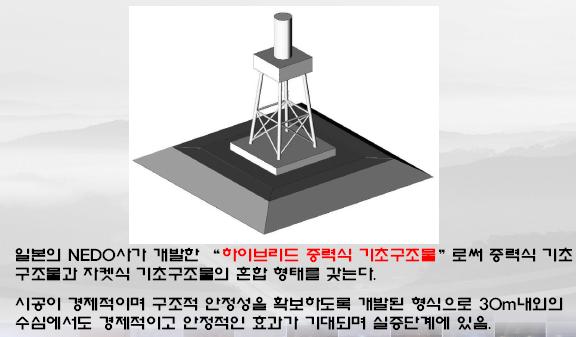 이어 모노파일 기초, 석션버켓기초, 트라이포드기초, 재킷기초 등 강관말뚝을 이용한 하부구조물 위에 재킷(풍력발전 설비)을 설치한 선진국의 사례를 제시하며 국내 해상풍력 환경을 기초로 강관말뚝 적용을 위한 우리만의 설치 기술 개발이 필요하다고 강조했다.