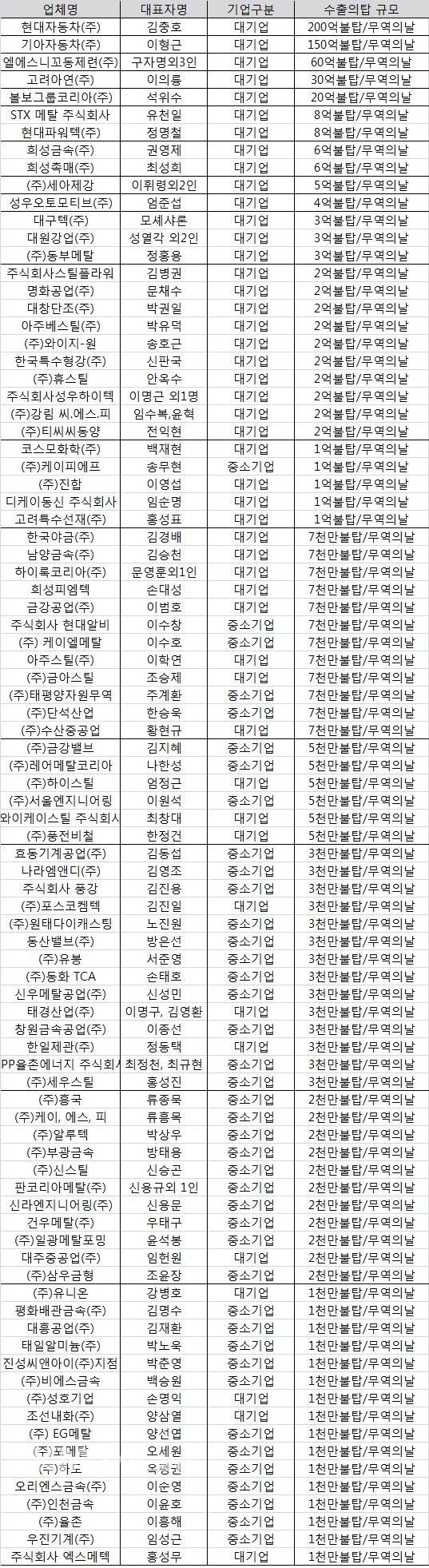 5일 개최된 제49회 무역의날 기념식에서 총 133개의 철강 및 비철금속 업체(수요연관 포함)들이 수출의탑을 수상했다. 다음은 1천만불 수출의탑까지의 수상자 리스트이다. 방정환 jhbang@snmnews.com 다른 기사 보기 저작권자 © 철강금속신문 무단전재 및 재배포 금지