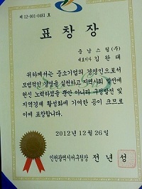 전년성 인천광역시 서구청장은 “중소기업 경영인으로써 모범적인 경영을 실천하고 지역사회 발전에 헌신 노력하셨을 뿐만 아니라 구정발전 및 지역경제 활성화에 기여한 공이 크다”며 표창장을 수여했다.