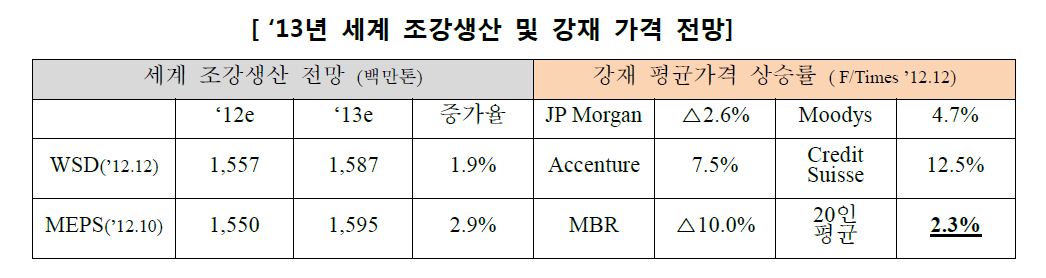 POSRI는 올해 전세계 조강생산은 전년대비 2%대, 강재 평균가격은 2.3%의 증가를 예상하면서도 전문기관별 가격전망에 대한 시각차가 확연할 정도로 철강산업의 경영환경 불확실성이 지속되고 있다고 진단했다. 철강원료 가격도 기상이변 등 공급차질 요인과 생산증대 등 공급확대 요인이 혼재하면서 변동 폭이 커질 가능성이 상존하고 있다는 분석이다.