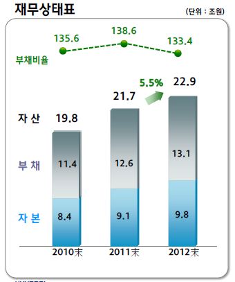 현대제철에 따르면 2012년 부채비율은 지난 2011년 138.6% 대비 5.2%p 감소한 133.4%로 나타났다. 자산총계는 2011년 21조7,000억원에서 5.5% 늘어난 22조9,000억원을 기록했다.