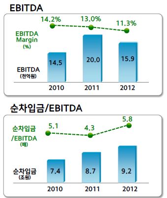 현대제철(부회장 박승하)이 31일 서울 여의도 한국거래소에서 열린 2012년도 경영실적 설명회에서 EBITDA(세전·이자지급전이익)와 순차입금/EBITDA를 발표했다. 구체적인 내용은 아래 표와 같다. 이광영 kylee@snmnews.com 다른 기사 보기 관련기사 (현대제철 IR) 현대제철 高爐 3기 주력·특수강투자 당분간 없다고 밝혀 저작권자 © 철강금속신문 무단전재 및 재배포 금지