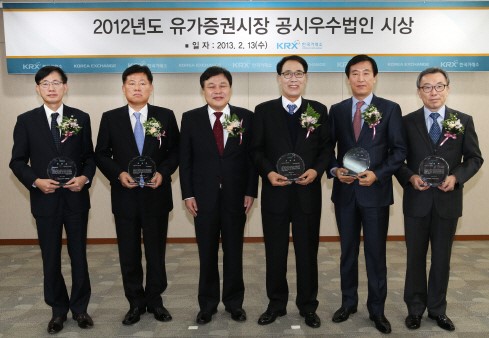 13일 한국거래소 유가증권시장본부는 현대제철, 호텔신라, S-Oil, 아세아시멘트, 아시아나항공 등 총 5개사를 2012년도 공시우수법인으로 선정하고 시상했다고 밝혔다.