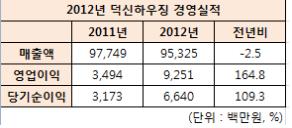 덕신하우징(대표 이수인)의 2012년 영업이익이 전년비 164.8% 증가한 92억5,100만원, 당기순이익은 전년비 109.3% 증가한 66억4,000만원을 기록했다. 매출액은 전년비 2.5% 감소한 953억2,500만원을 기록했다.